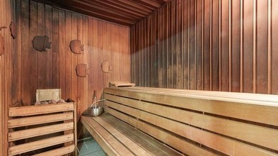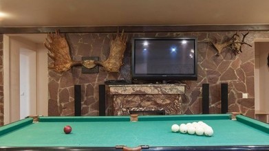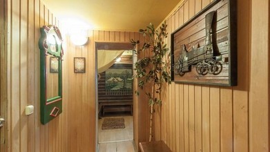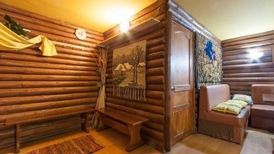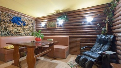 Сауна оформлена в виде охотничьего домика, и имеет свой DVD, стереосистему, 2 зала: малый и бильярдный с большим камином и медвежьей шкурой, телевизором и обеденной зоной с мягкими диванами. Все залы полностью автономны.